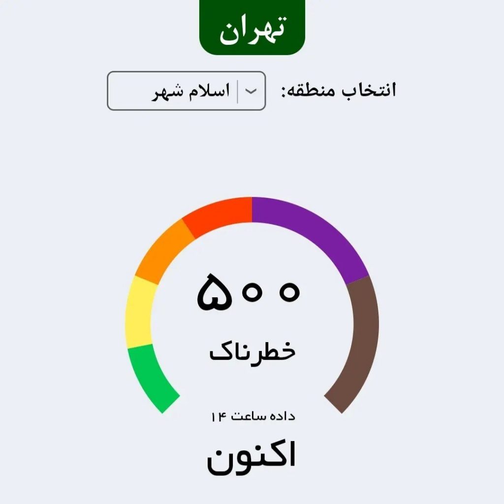 میانگین کیفیت هوای اسلامشهر با شاخص ۵۰۰ در شرایط خطرناک قرار دارد.