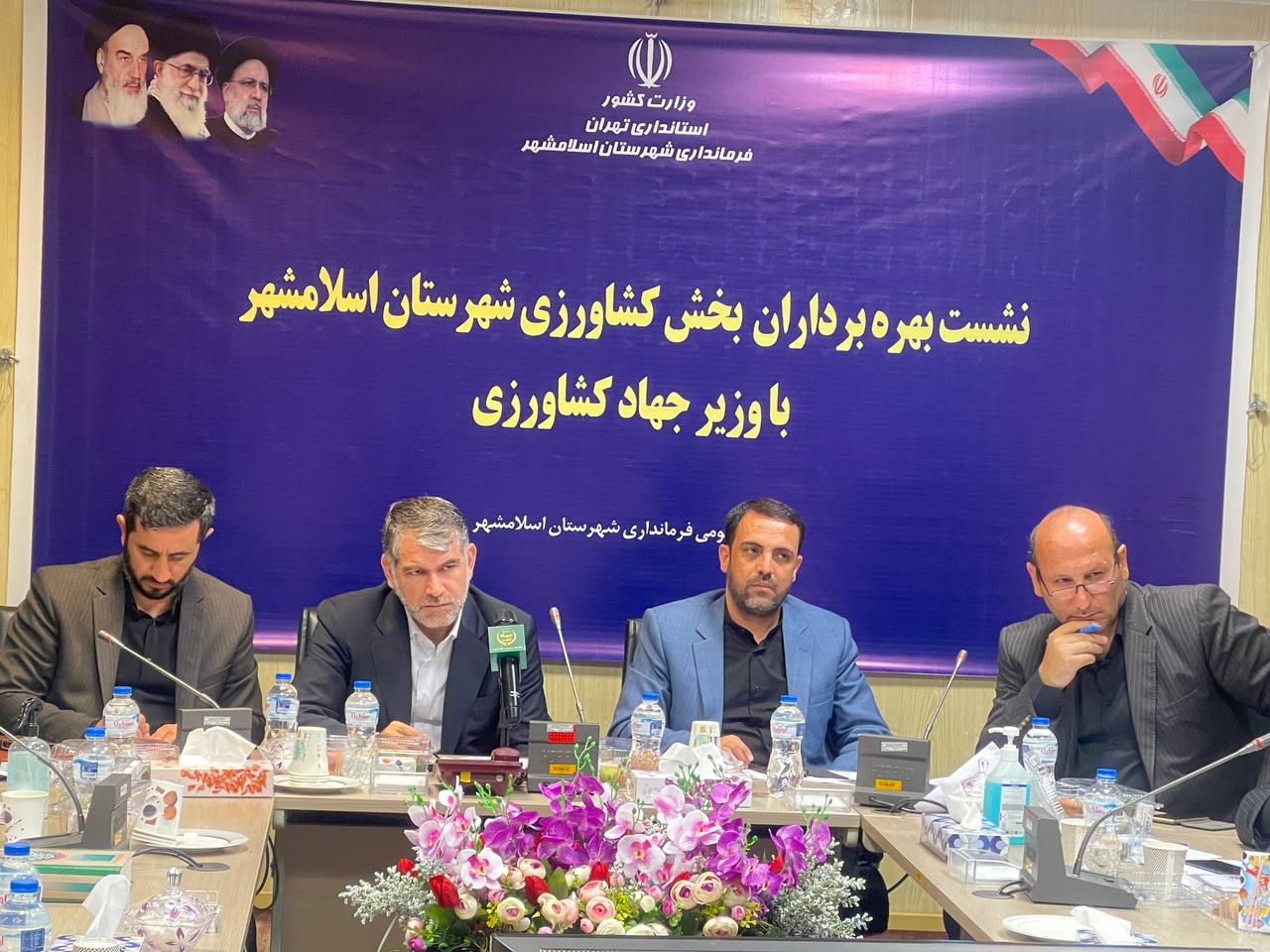 وزیر جهاد کشاورزی با اشاره به دستاوردهای سفر خود به شهرستان اسلامشهر، خاطرنشان کرد:  بازدیدهای امروز و دغدغه‌ها و مسائل مطرح شده در این جلسه نشان می‌دهد که ظرفیت و پتانسیل‌های خوبی در شهرستان اسلامشهر در حوزه کشاورزی داریم که با پیگیری‌های فرماندار و نماینده مجلس و با تلاش های فعالان سخت کوش و پرتلاش این بخش، امیدوارم بتوانیم با رفع موانع، وضعیت کشاورزی منطقه را بهبود و ارتقاء بخشیم.
